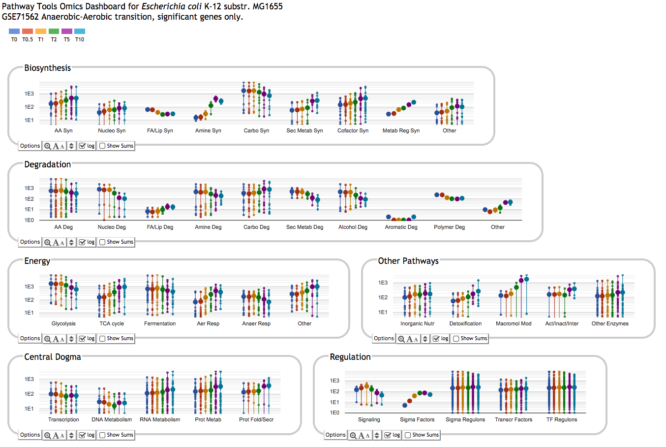 • The Omics Dashboard provides a system-oriented view of omics datasets, enabling the user to view aggregate responses of cellular systems such as biosynthesis and DNA repair, and responses and the pathway and gene levels: